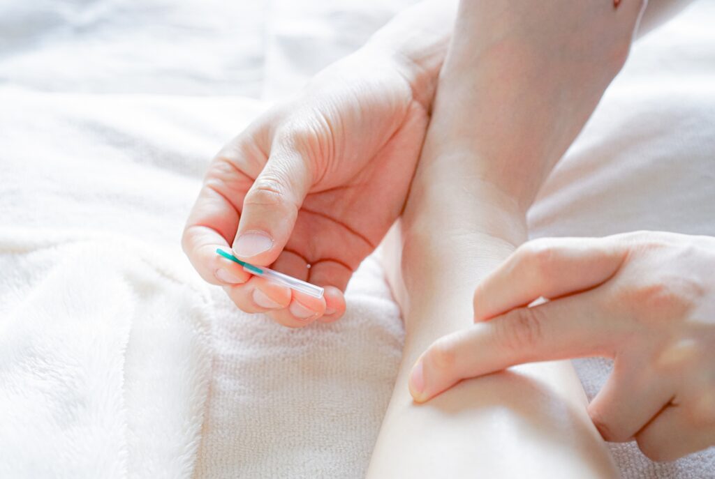 鍼が皮膚を通過する際は、ほとんど痛みを感じない方が大半です。多くの場合、チクッとするよりも「何も感じない」という感想をいただきます。